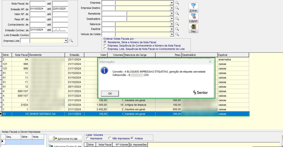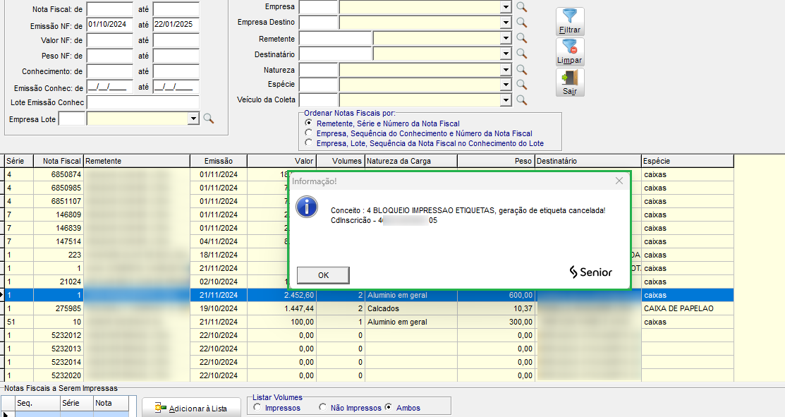Na tela de Etiquetas de Volumes, ao tentar adicionar na lista a nota fiscal configurada, o sistema exibirá a seguinte mensagem para o usuário: