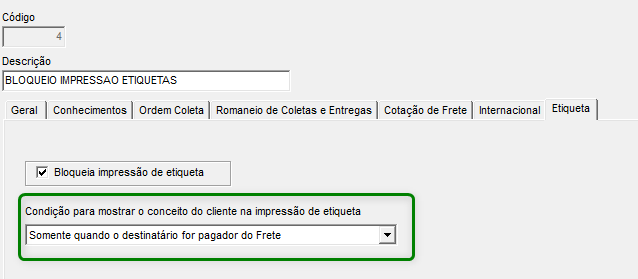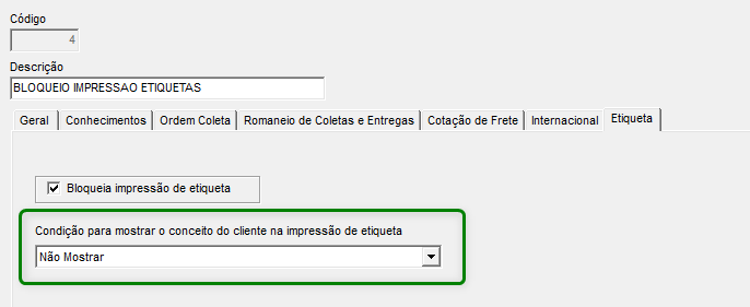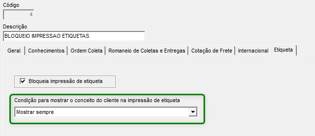 Na tela de Conceitos de Clientes e Fornecedores em Cadastros > Clientes e Fornecedores > Conceito de Clientes e Fornecedores, na guia Etiqueta, existe a opção Bloqueia impressão de etiqueta. Quando esta opção estiver marcada, as condições definidas no campo Condição para mostrar o conceito do cliente na impressão de etiqueta serão aplicadas na tela de impressão de etiquetas. As opções disponíveis são: