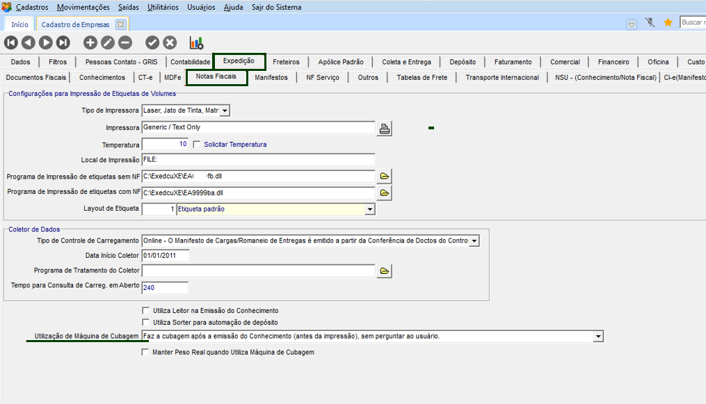 Ainda no módulo CFG em Cadastros > Empresas, coma empresa do conhecimento selecionado, na guia Expedição > Notas Fiscais, marcada a configuração para Utilização de Máquina de Cubagem.