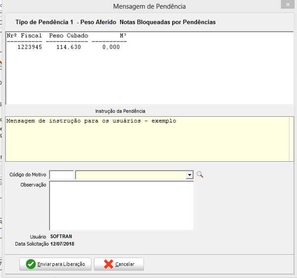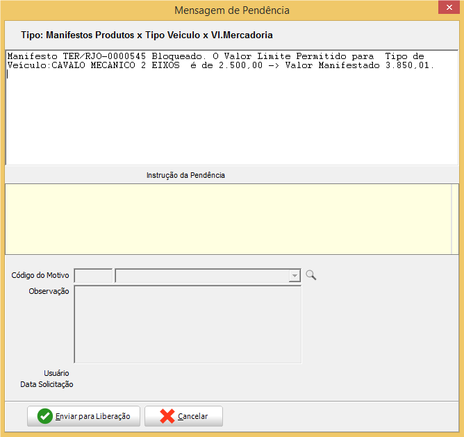 Se a pendência for cadastrada exigindo o preenchimento do motivo, ao solicitar liberação será obrigatório o preenchimento do motivo.