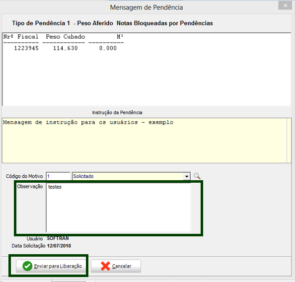 Em seguida é apresentada a tela para informar o motivo da liberação, sendo obrigatório preenchimento de observação de acordo com o que o foi configurado no cadastro. Clique em OK. Assim a pendência é liberada.