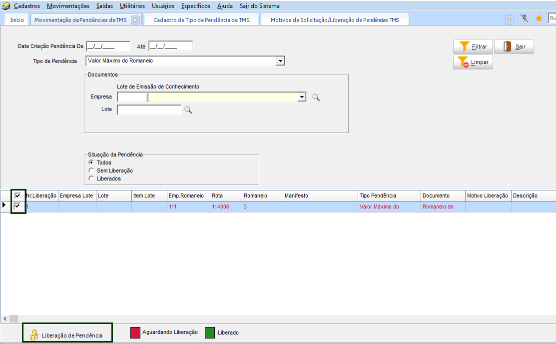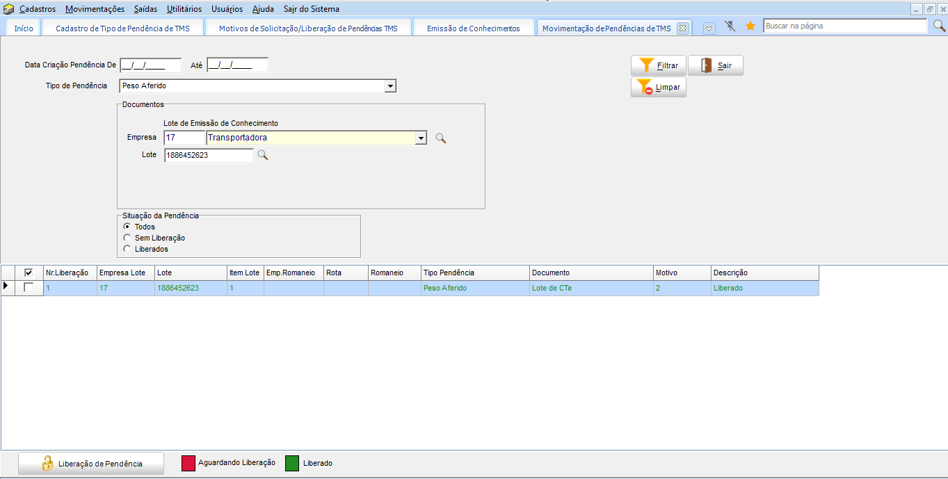 Em Movimentações > Liberação de Pendências TMS, será apresentada as pendências solicitadas, que pode ser filtrada diretamente pelo lote do conhecimento: