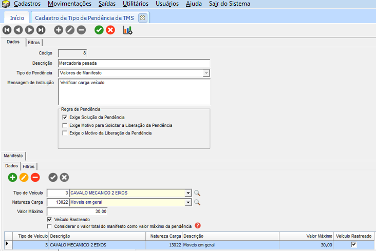 Para gerar pendência de Valores de Manifesto acesse o módulo EXP em Cadastros > Cadastros Gerais > Tipos de Pendências TMS, com o tipo de pendência Valores de Manifesto. O sistema permitirá adicionar as regras de bloqueio de impressão do Manifesto, informando o valor máximo da mercadoria de acordo com a natureza da carga e o tipo de veículo que serão validados no momento da impressão do manifesto.