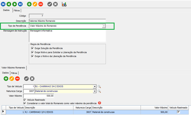 Para gerar pendência de Valores Máximo do Romaneio acesse o módulo EXP em Cadastros > Cadastros Gerais > Tipos de Pendências TMS, com o tipo de pendência Valores Máximo de Romaneio, o sistema permite adicionar o Tipo de Veículo e Natureza de Carga do romaneio, informando o valor máximo que serão validados pelo romaneio de coletas e entregas.