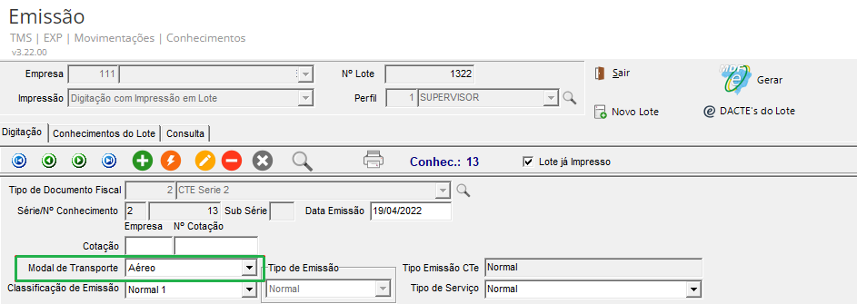 No módulo EXP, em Movimentações > Conhecimentos > Emissão, cadastrado um CTe com o Modal de transporte do tipo Aéreo.