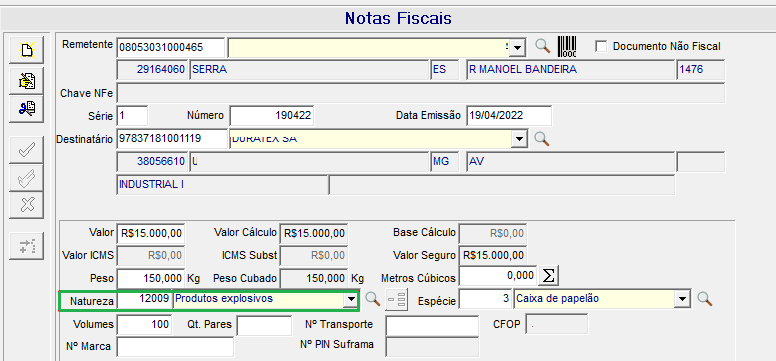 Quando as notas fiscais tiverem itens, aos quais as naturezas de cargas forem do tipo carga perigosa, o sistema verifica as informações de manuseio que estão vinculadas a esta natureza e se existe obrigatoriedade para apresentar no CTe.