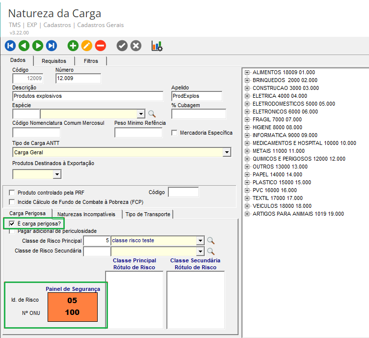 Em Cadastros > Cadastros Gerais > Natureza da Carga, para que sejam apresentadas as informações corretas, marcar a opção de Carga perigosa e informar o Número do ONU.