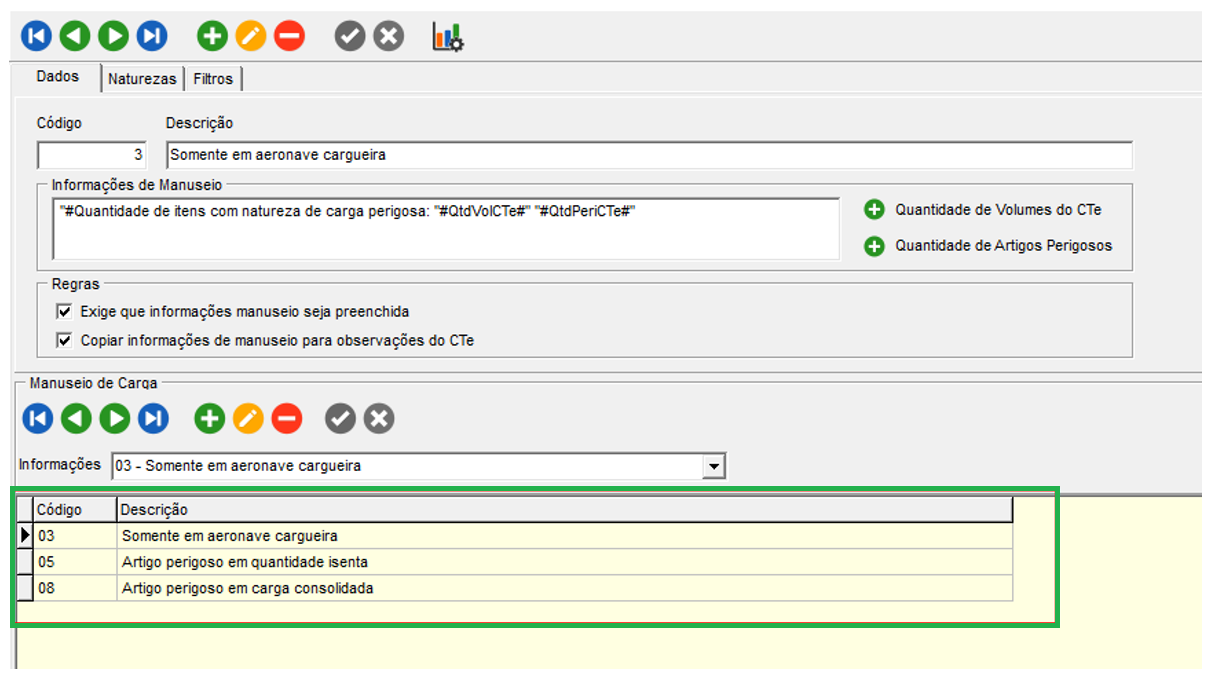 Para verificar a natureza da carga informada na Nota Fiscal do CT-e, temos o código da informação de manuseio. No cadastro das informações de manuseio, é apresentado os códigos de natureza que estão vinculadas a natureza principal.