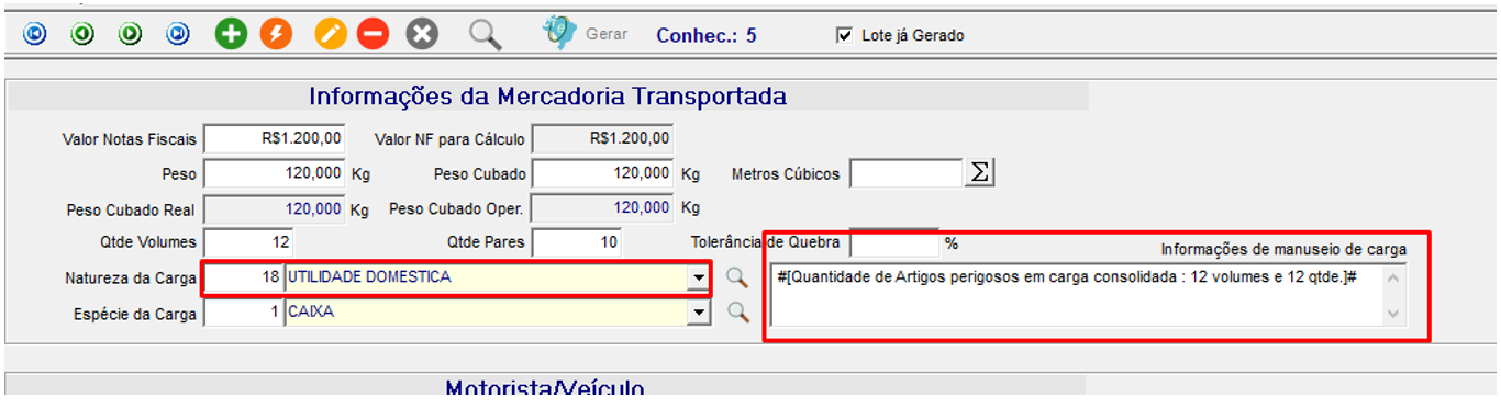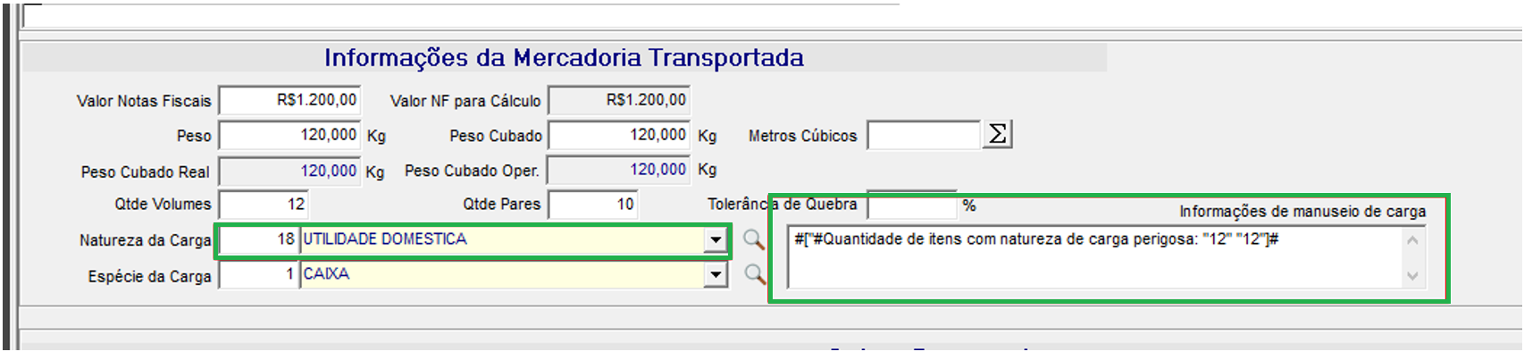 Na Emissão de Conhecimentos, informe Natureza de Carga, utilize então a tecla TAB, para que o campo Informações de manuseio de Carga seja autopreenchido de acordo com a natureza de carga selecionada. Entre os caracteres #[ ]# para identificar que é o texto padrão do cadastro de informações de manuseio, onde: