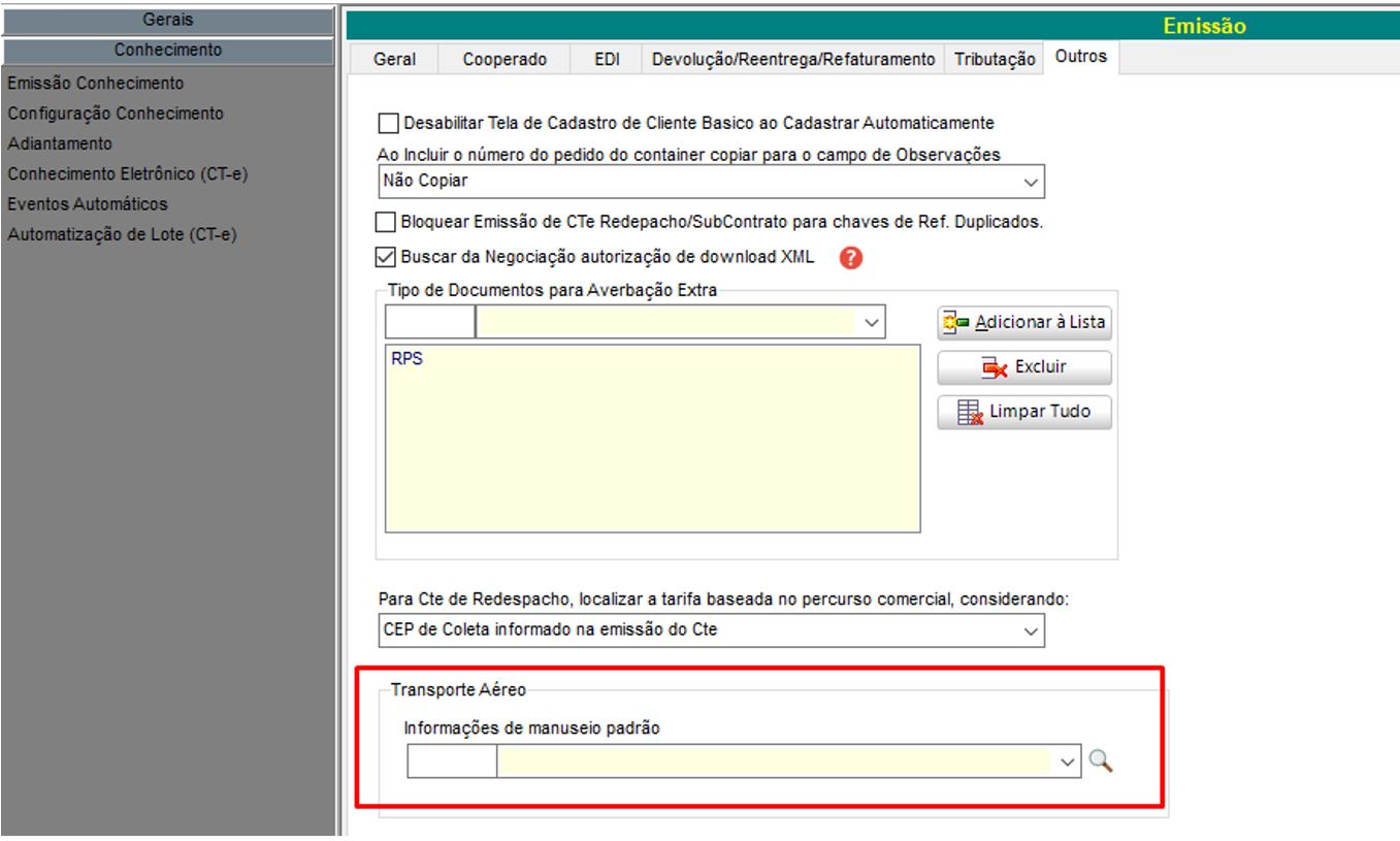 Em Utilitários > Configurações > TMS > EXP – Expedição, na guia Conhecimento > Emissão Conhecimento, sub-guia Outros temos a configuração: Informações de manuseio padrão, referente ao Transporte Aéreo, o sistema busca as informações do Cadastro de Informações de Manuseio da Carga.