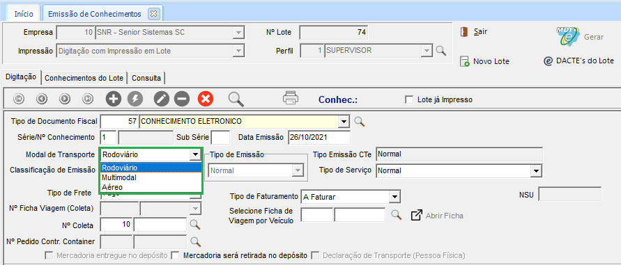 Ao realizar a emissão, no campo Modal de Transporte, serão listados também os modais: Multimodal e Aéreo: