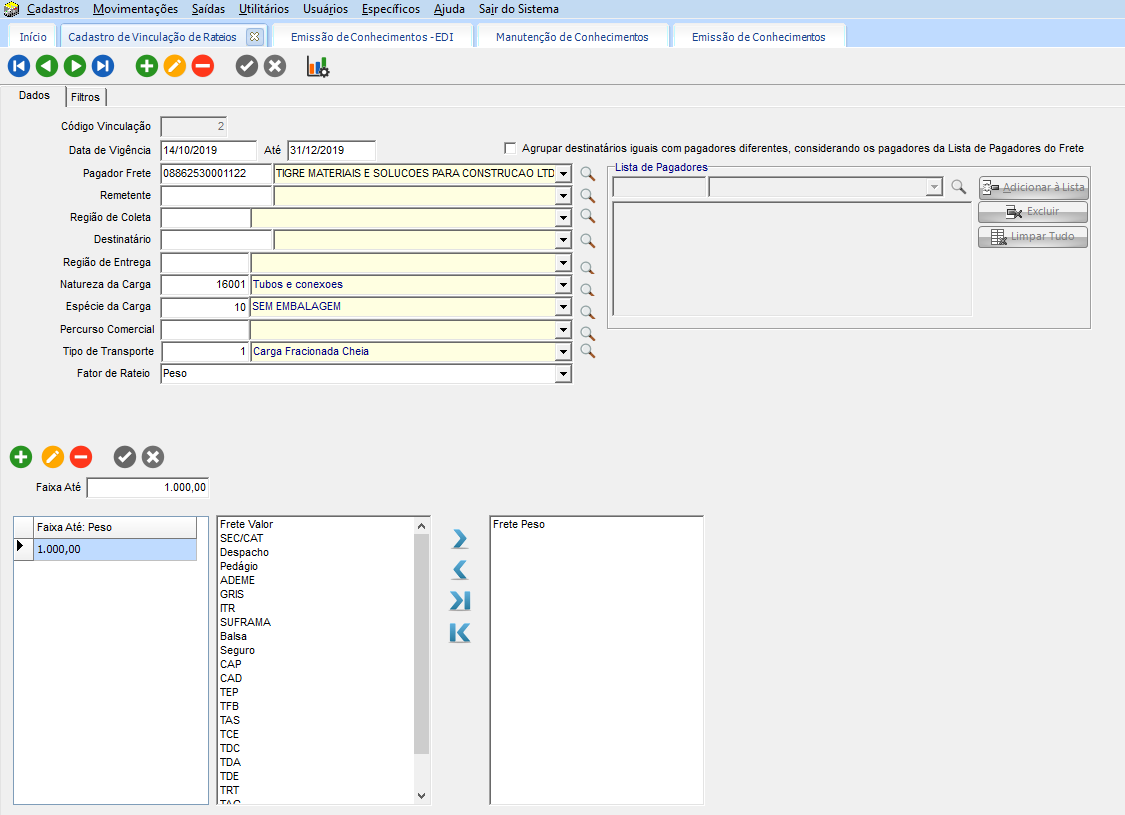 No módulo EXP, em Cadastros > EDI > Vinculação de Rateios, realizado um cadastro que tenha os dados do conhecimento que irá emitir. O campo Pagador deve ser preenchido e o fator de rateio será feito pela quantidade de conhecimentos.