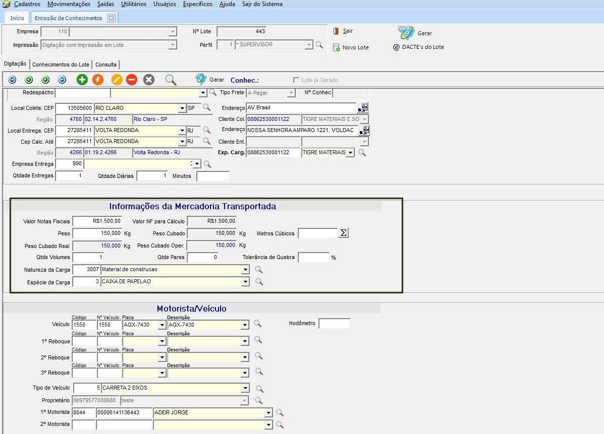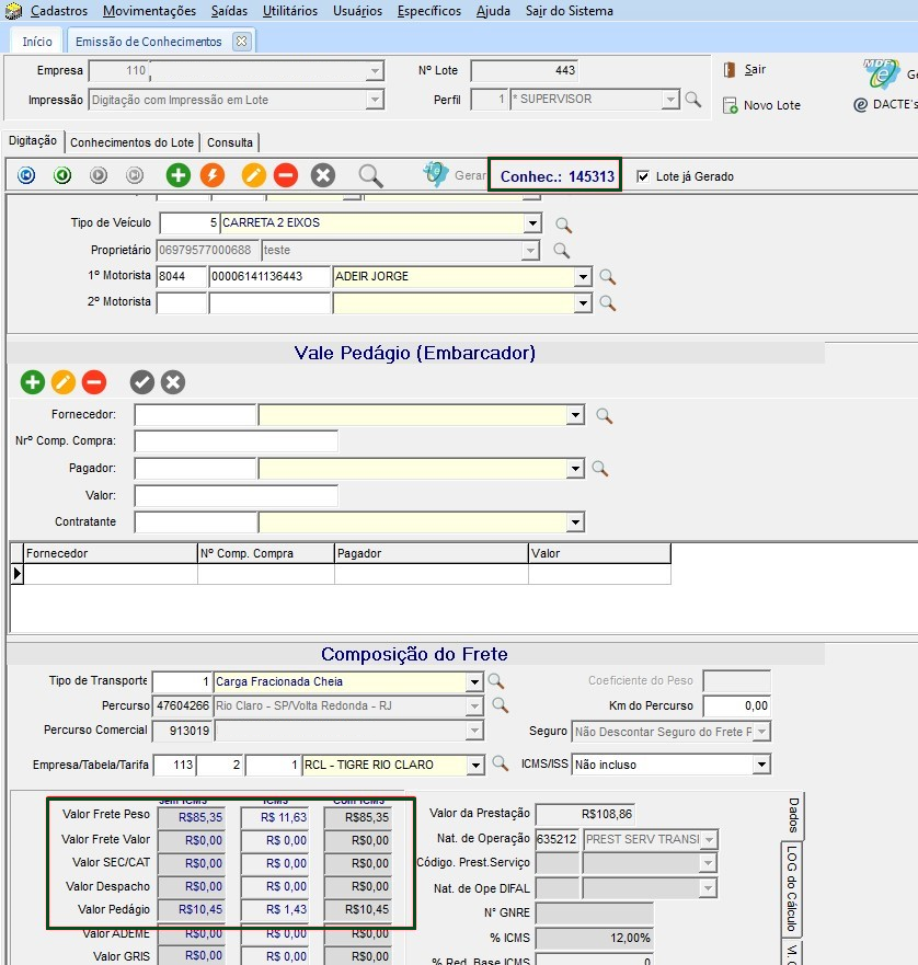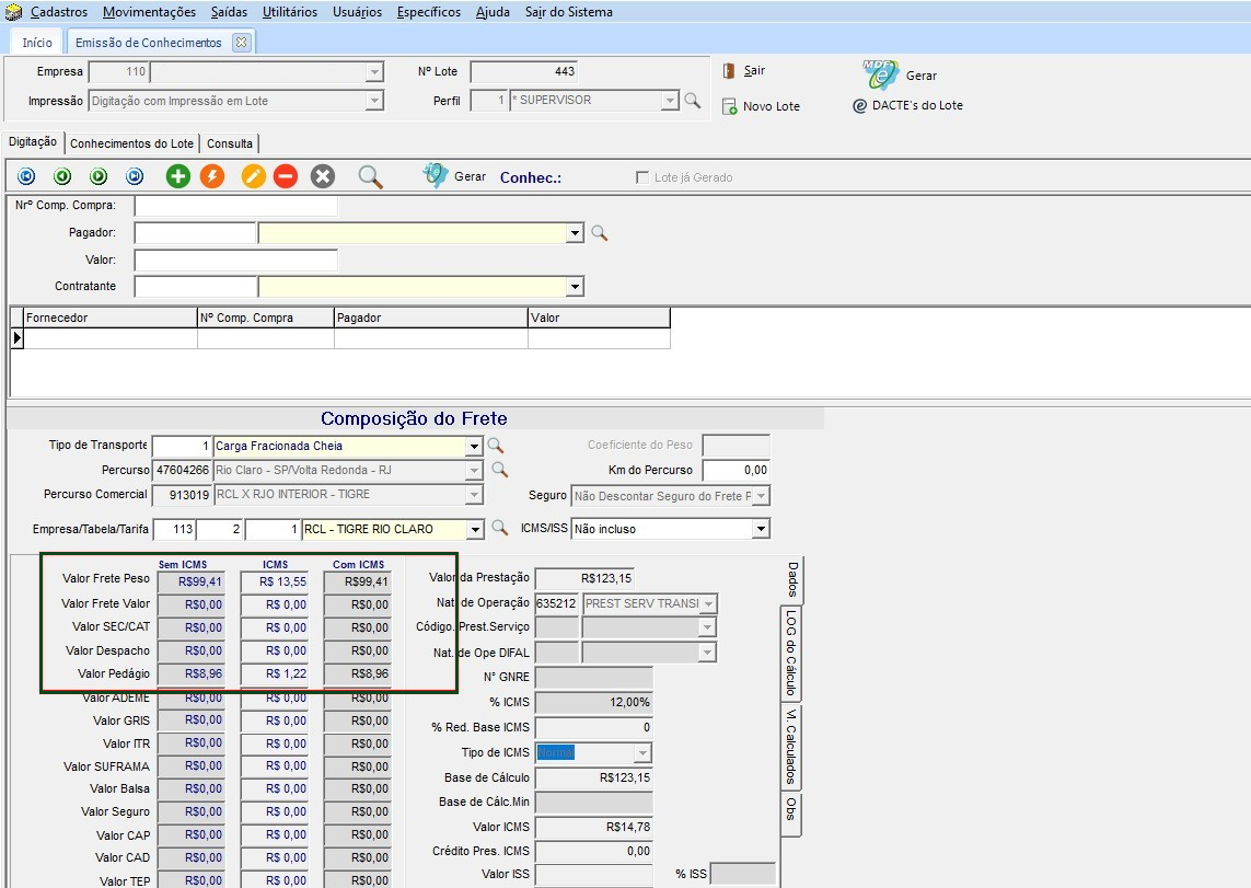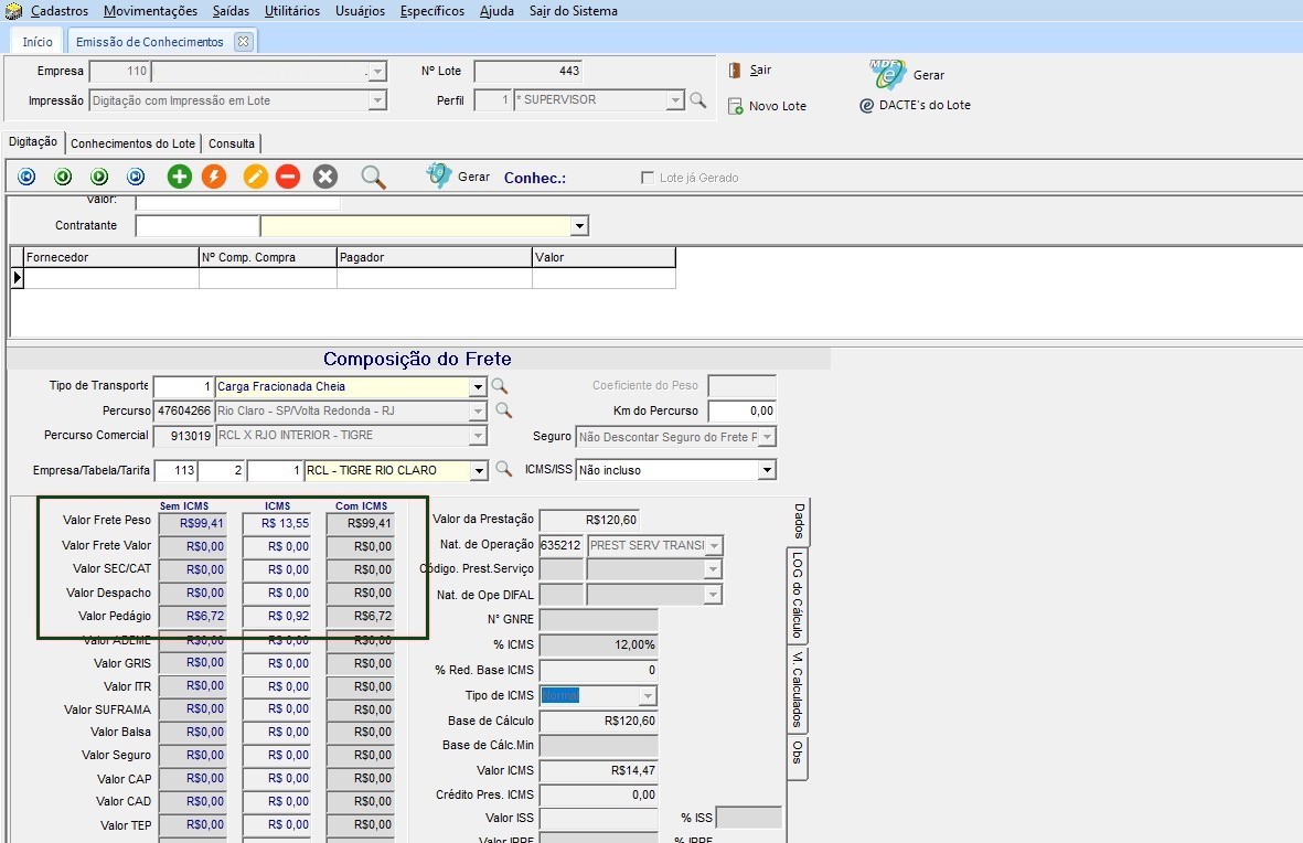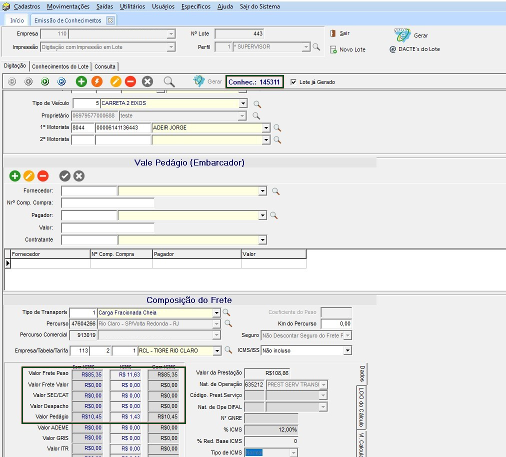 Em Movimentações > Conhecimentos > Emissão, para este exemplo, cadastramos um lote com 3 (três) conhecimentos. Os valores de cada um são:
