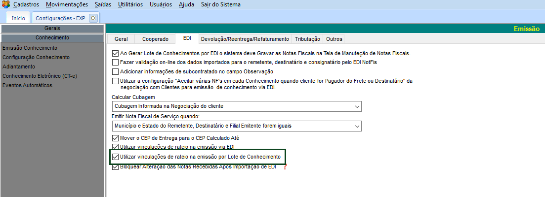 No módulo CFG, em Utilitários > Configurações > TMS > EXP – Expedição, na guia Conhecimento > Emissão Conhecimento > EDI, marcar a configuração Utilizar vinculações de rateio na emissão por Lote de Conhecimento.