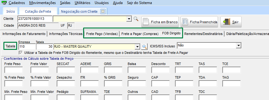 - Avisar na Digitação: Para: Frete a Pagar, Cortesia ou A Vista para Regiões Pagador do Frete Cliente com Tabelas de Frete própria
