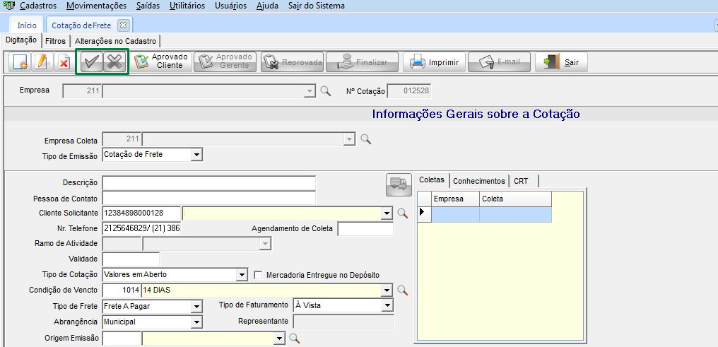 - Opção Sim: o sistema mantém o campo zerado e permite a emissão da cotação.