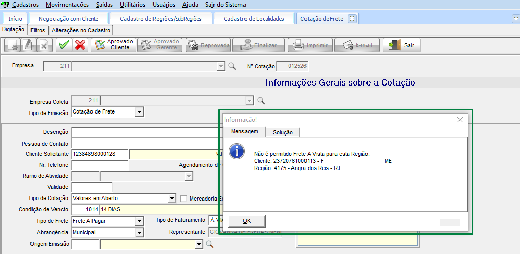 Em Movimentações > Cotação de Frete, cadastrado um novo informando frete a vista e o cliente configurado para o pagador do frete. De acordo com a configuração, ao gravar a tela, o sistema informa a mensagem que não permite de acordo com região informada.