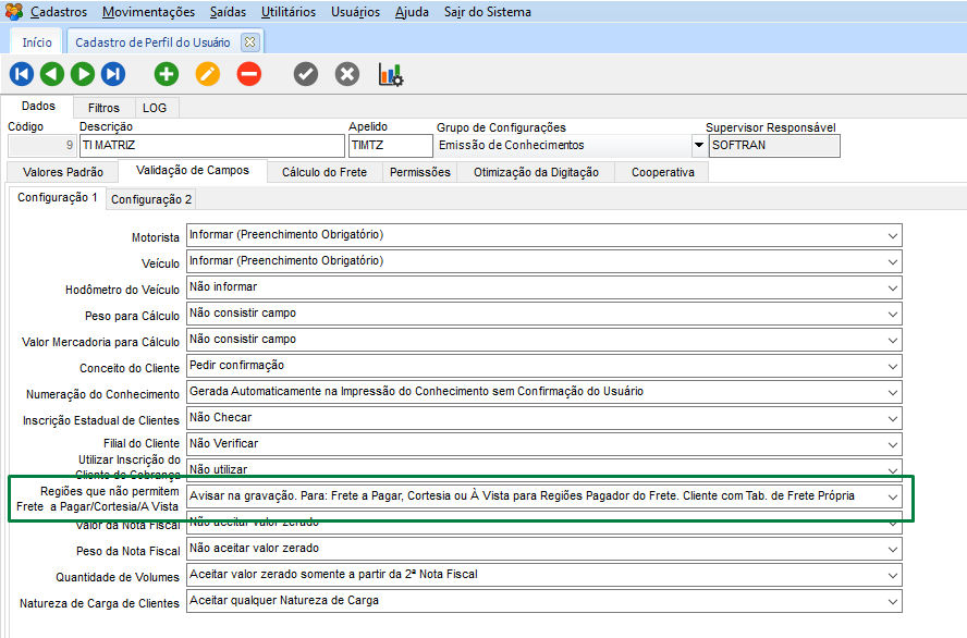 No módulo CFG, em Cadastros > Usuários > Perfil do Usuário, no grupo de configurações: Cotação de Frete > guia Validação de Campos, adicionada novas funcionalidades na configuração já existente: Regiões que não permitem Frete a Pagar/Cortesia/À Vista.