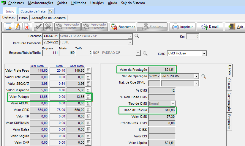 Valor do CTe com pedágio incluso na base, considerando a empresa de coleta: ![]()