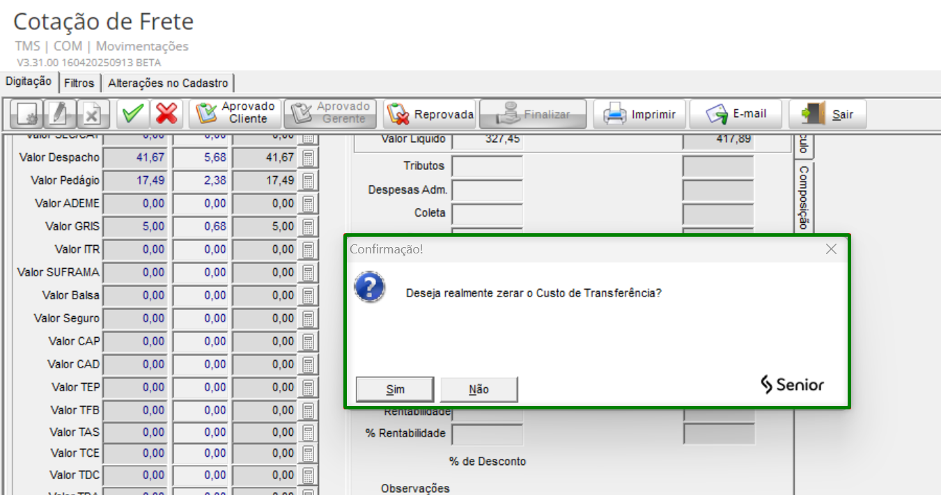 Em Movimentações > Cotação de Frete, na parte de baixo da tela, em Totalização do Frete, guia Propostas são exibidas as informações dos valores, incluindo o valor de Transferência. Se o usuário alterar o valor do campo Transferência para zero (0), o sistema exibe a mensagem de confirmação: