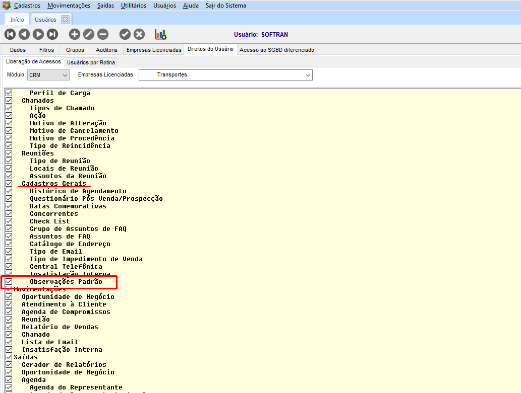 No módulo CFG, em Cadastros > Usuários > Cadastro de Usuários, guia Direitos do Usuário > Liberação de Acessos, marque a opção do cadastro de Observações Padrão, na lista de permissões do usuário.