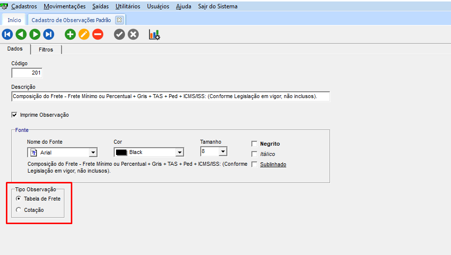 O cadastro de Observações Padrão, possui a configuração por tipo de observação, sendo elas: tabela de frete e cotação. Onde o sistema permite cadastrar novas observações de acordo com o seu tipo.