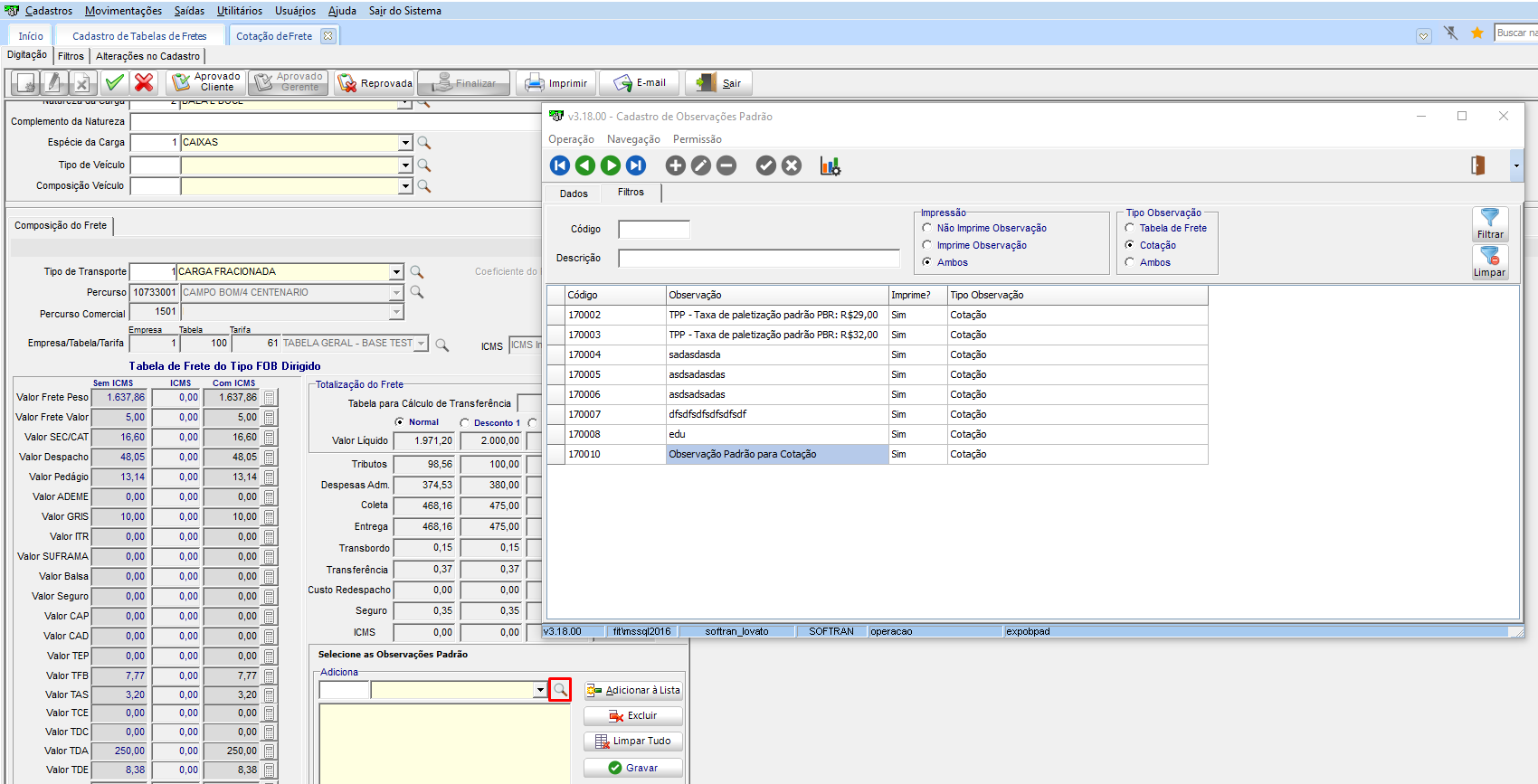 Em Movimentações > Cotação de Frete, na opção de Selecione as observações padrão, permite selecionar de acordo com o tipo cotação e não permite informar uma observação do tipo tabela de frete na cotação.