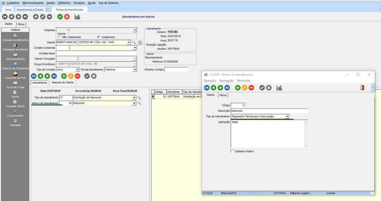 No módulo CRM em Movimentações > Atendimento à Cliente, cadastre um novo atendimento. Na guia Atendimento, informe um tipo de atendimento que esteja relacionado ao novo Tipo de atendimento adicionado no cadastrado. O campo Motivo de Atendimento, precisa ter o tipo de atendimento igual ao campo anterior.