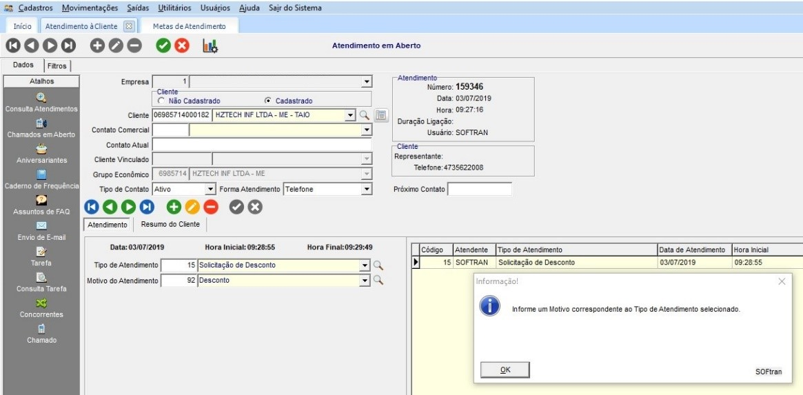 Se o tipo for diferente, será apresentado a mensagem “Informe um Motivo correspondente ao Tipo de Atendimento selecionado” ao usuário, pois esses campos precisam conter a mesma informação.