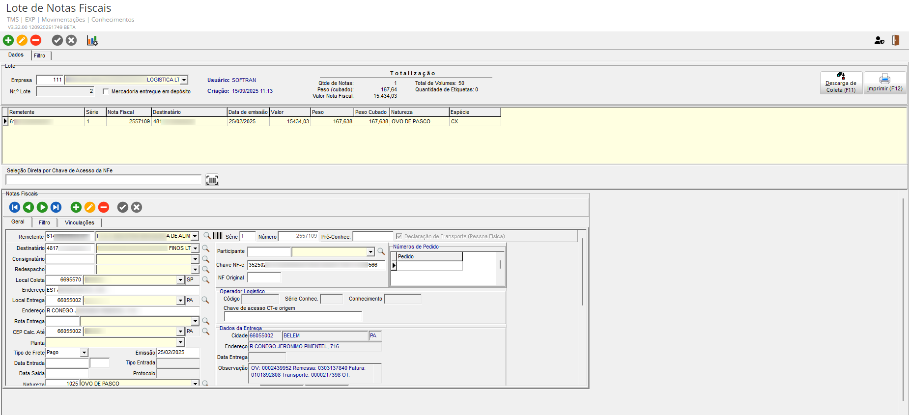 Na tela de Lote de Notas Fiscais, foi incluído o campo Seleção Direta por Chave de Acesso da NFe. Esse campo permite a leitura do código de barras e a validação da emissão de etiquetas, proporcionando maior agilidade no processo.