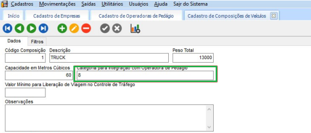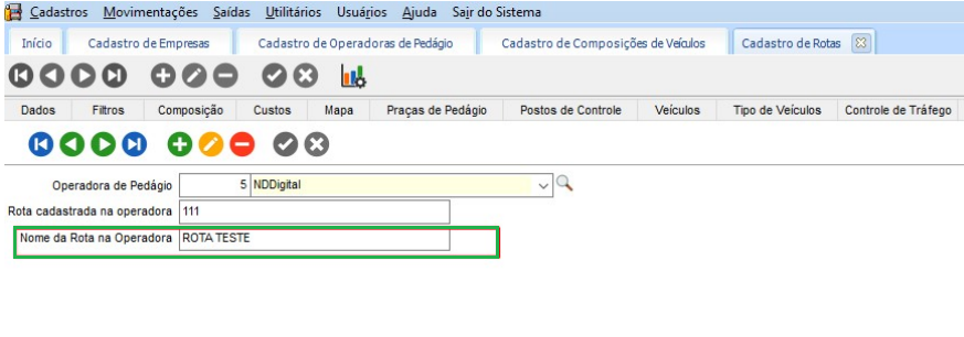 - Para o Campo 2 Categoria Pedágio: FTR > Cadastros > Logística > Operadora de Pedágio. Configurado de acordo com o Manual da NDD: