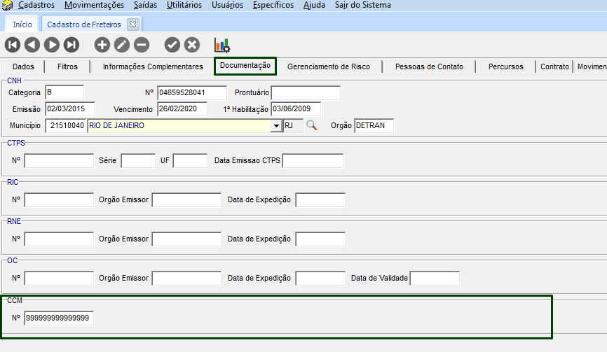 No módulo FTR, em Cadastros > Motoristas > Freteiros, na guia Documentação, o campo CCM deve estar preenchido, com a apresentação do número referente ao cadastro de contribuintes mobiliários.