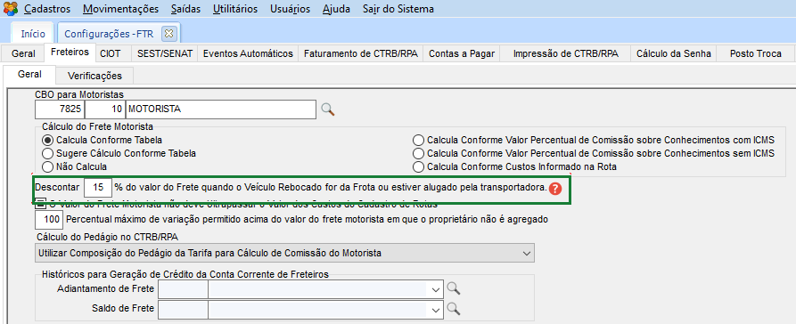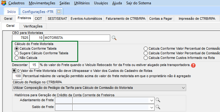 Na opção Cálculo do Frete Motorista, precisar estar marcado uma das opções abaixo: