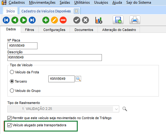 No módulo FTR, em Cadastros > Veículos > Veículos Disponíveis, está a configuração Veículo alugado pela transportadora: