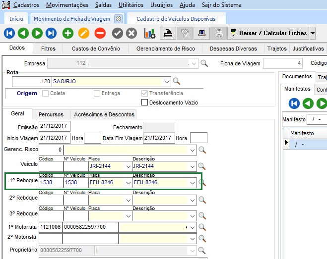 Abra a ficha de viagem na guia Custos de Convênio e confira para que tenha valores dos custos calculados. Na guia Dados o reboque informado na ficha de viagem precisa estar com o veículo marcado ter a flag de Veículo Alugado marcada conforme o item configuração: