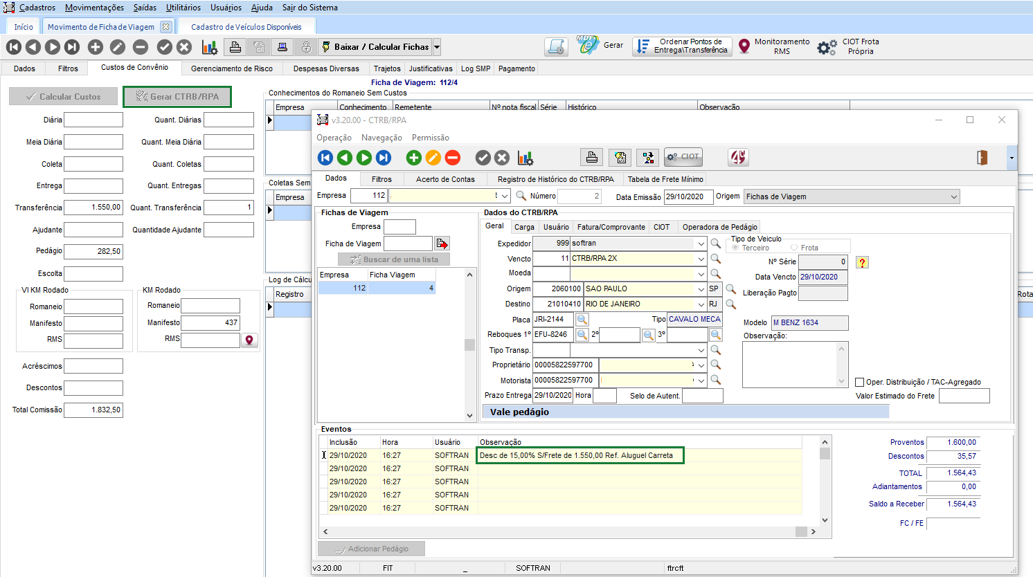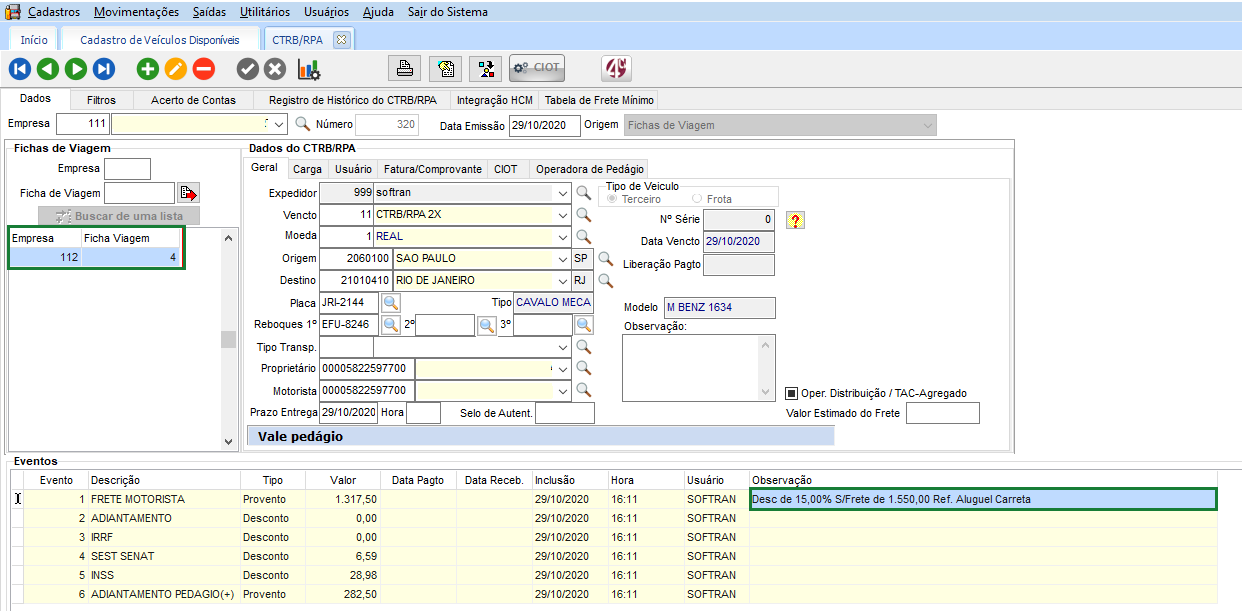 No CTRB/RPA, adicionado a ficha de viagem. O sistema apresenta no campo Observação, a informação referente ao desconto de carreta configurado. Onde, é considera o valor da comissão, menos o pedágio, de acordo com a guia Custos de Convênio da ficha de viagem.