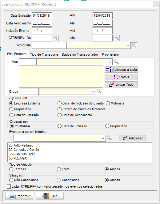 Selecione os dados para realização dos filtros do relatório (data de emissão, data de vencimento, motorista, grupo de empresas, lista de proprietários etc.), selecione também por qual campo agrupar e qual campo ordenar por e os Eventos que serão listados no relatório e clique em Imprimir.