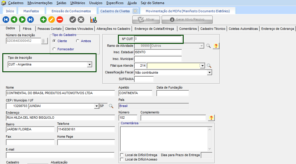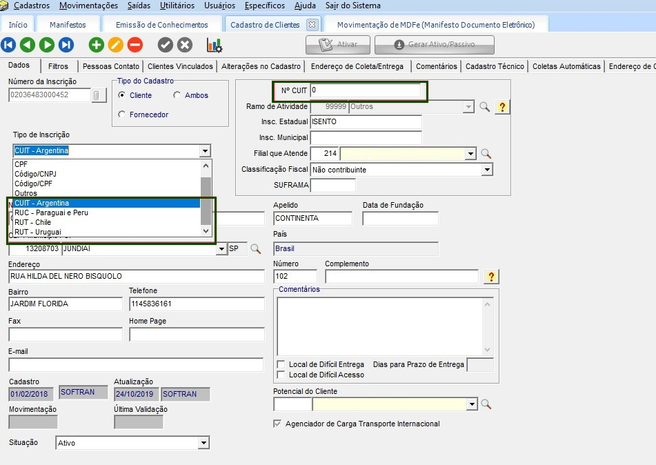 Em Cadastros > Clientes e Fornecedores > Clientes e Fornecedores, localizar um cadastro, onde o tipo de inscrição, seja referente a clientes internacionais e o número do CUIT, RUT, sejam zeros.