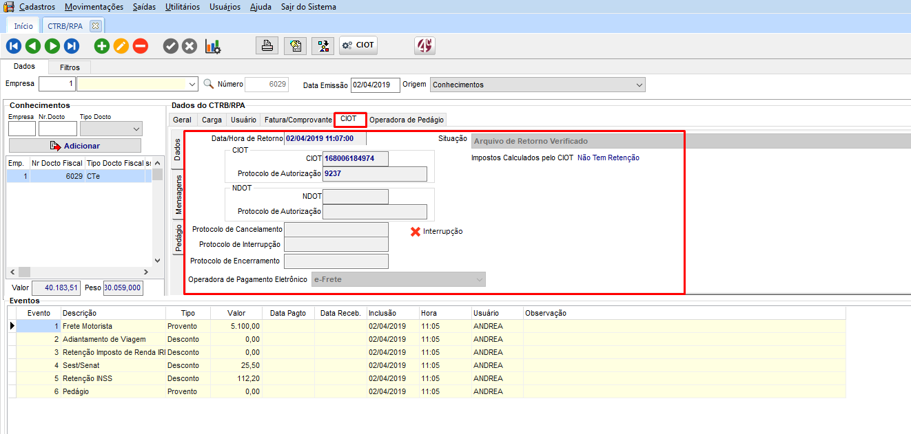 - Gerar o CTRB/RPA, com origem Conhecimentos (com este conhecimento cadastrado vinculado) e autorizar o CIOT;