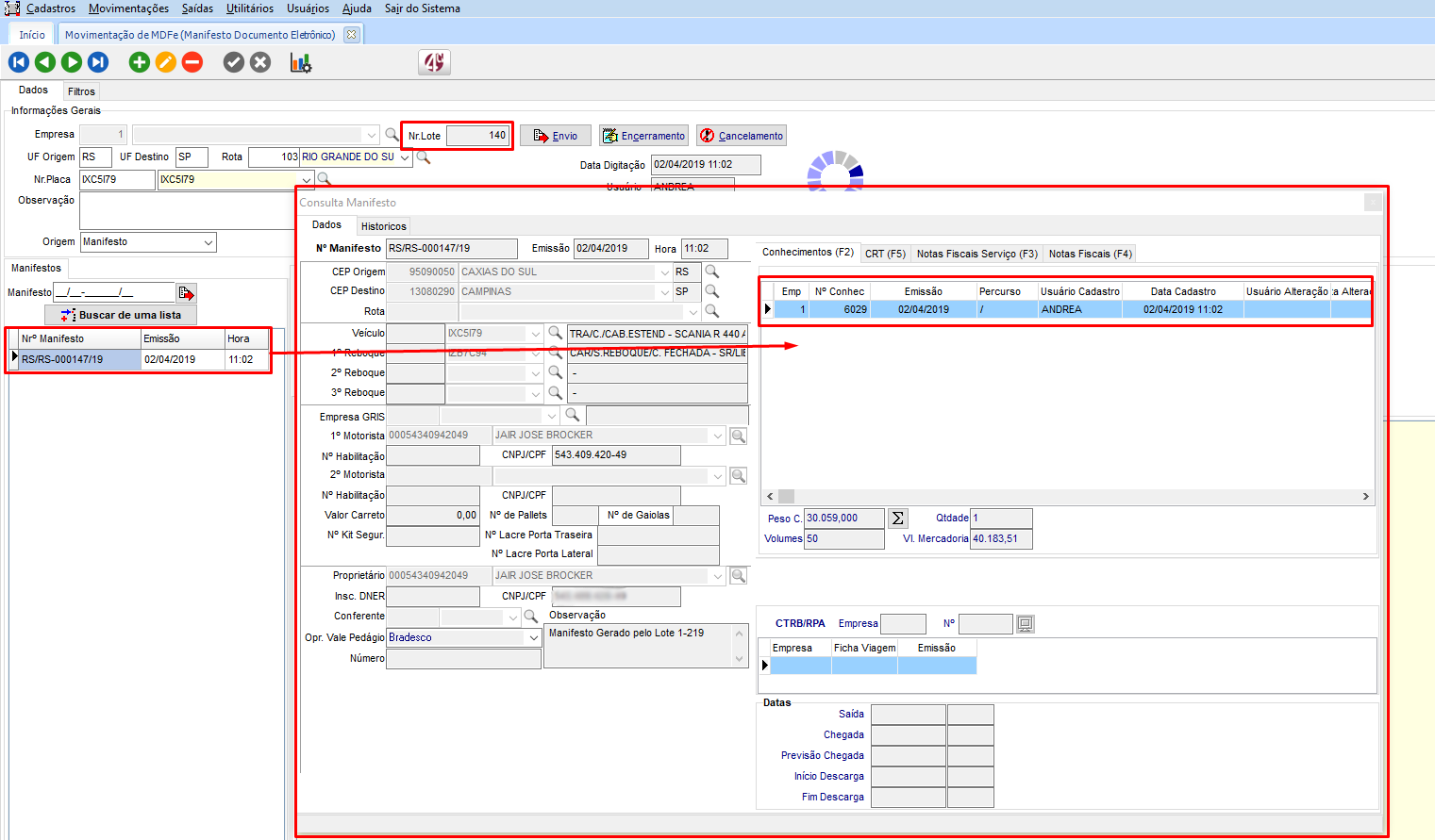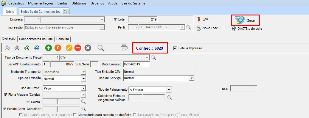 - A partir da rotina de emissão de conhecimento, gerar o MDFe (gera o manifesto e o lote do MDFe);