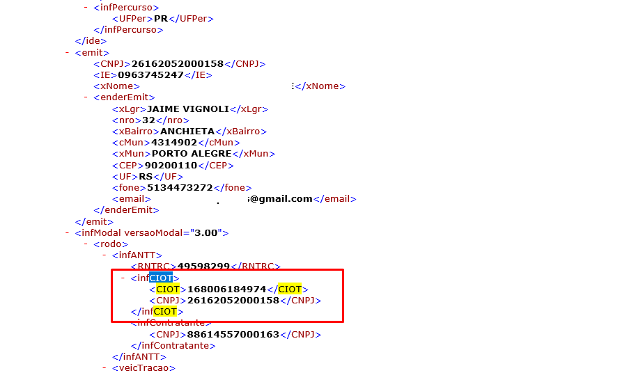 Ao verificar o XML gerado, o sistema gravou corretamente a tag CIOT com a informação do número do CIOT.
