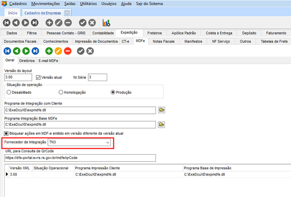MDFe > Geral, deve ser alterado o campo Fornecedor de Integração para TN3.