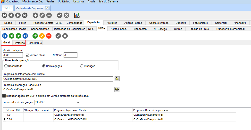 No módulo CFG, em Cadastros > Empresas, selecione a empresa do MDF-e, e na guia Expedição > MDFe, guia Geral, configure as DLLs de impressão. No mesmo local na guia Diretório, informe o caminho que será salvo o XML.