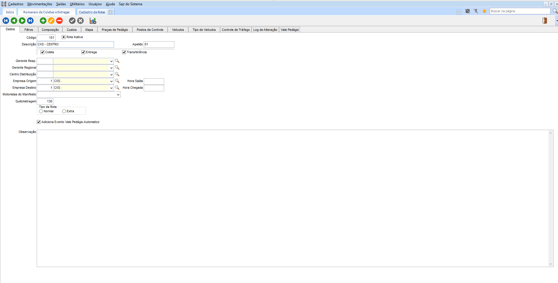 No módulo CCE em Cadastros > Logística > Rotas, o sistema verifica os campos de Empresa Origem e Empresa Destino neste cadastro, para geração do MDFe via Romaneio.