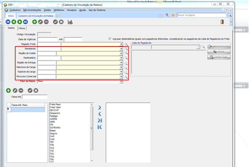 Como na rotina de vinculação de Tabela, a vinculação de Rateio tem a mesma funcionalidade; Criar combinações para serem utilizadas durante o processo de geração dos documentos CTE, consistindo se as combinações encontradas estão dentro da regra estabelecida pelo cadastro, bem como se a metodologia de operações de Transporte dos Embarcadores está dentro das especificações da Regra.