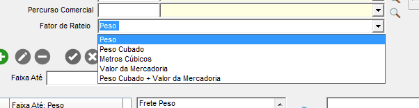 Exemplo: Se a Faixa de Rateio for selecionada para que seja por Peso Cubado a referência dos valores do Faixa Até será para o campo Peso Cubado do CTe. Dessa forma pode-se criar uma Regra extra para indicar a abrangência do fator utilizado.
