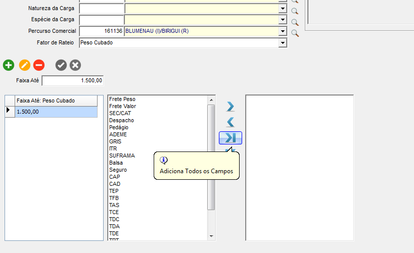 - Uma Faixa de Até 1.500 com referência ao fator de cubagem, Peso Cubado e na Tela ao lado uma referência dos campos de Frete do CT-e que farão parte do rateio do Frete Total.