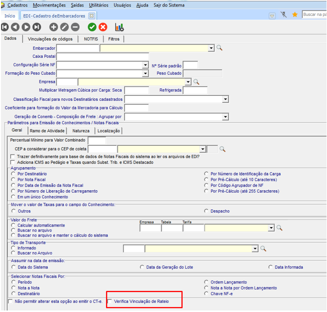 • Em Cadastros > EDI > Embarcadores, com o cadastro do embarcador que será utilizado na geração do lote de conhecimento, marcada a configuração para verificar a vinculação de rateio.