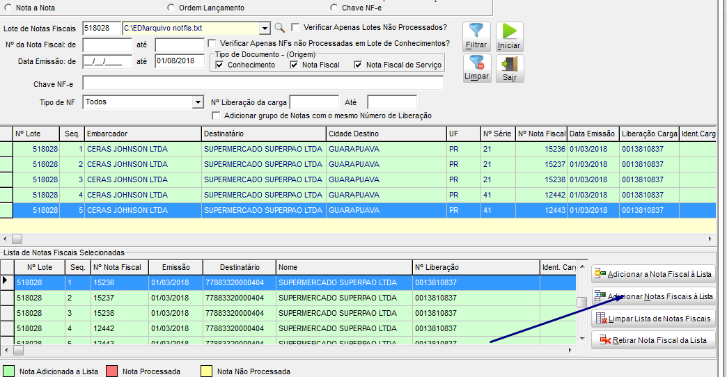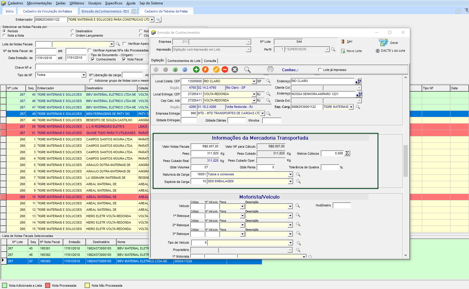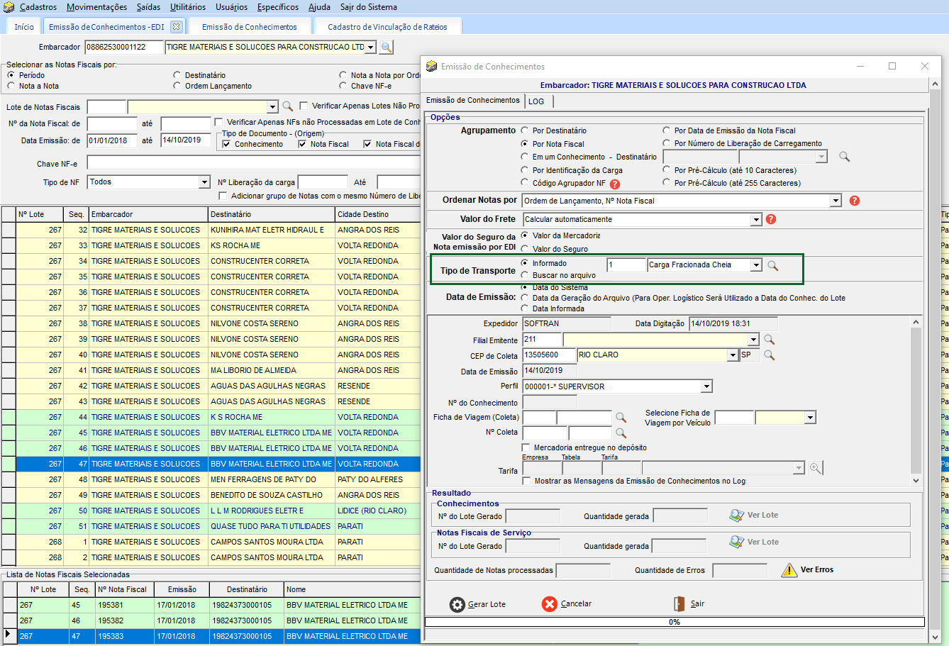 Em Movimentações > EDI > Emissão > Conhecimentos, adicionado algumas notas na lista, que estejam de acordo com a vinculação e clicar em Iniciar.