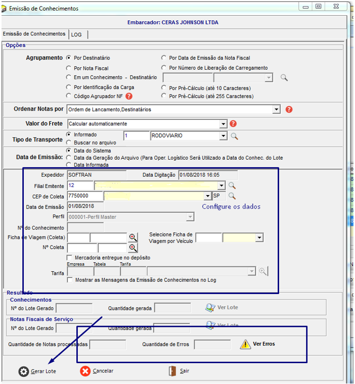 Os dados referente a geração deverão ser preenchidos automaticamente devido as previas configurações do Embarcador, caso não estejam preenchidas , deve-se informar os dados imprescindíveis para emissão do CTe e clique no botão Gerar Lote.